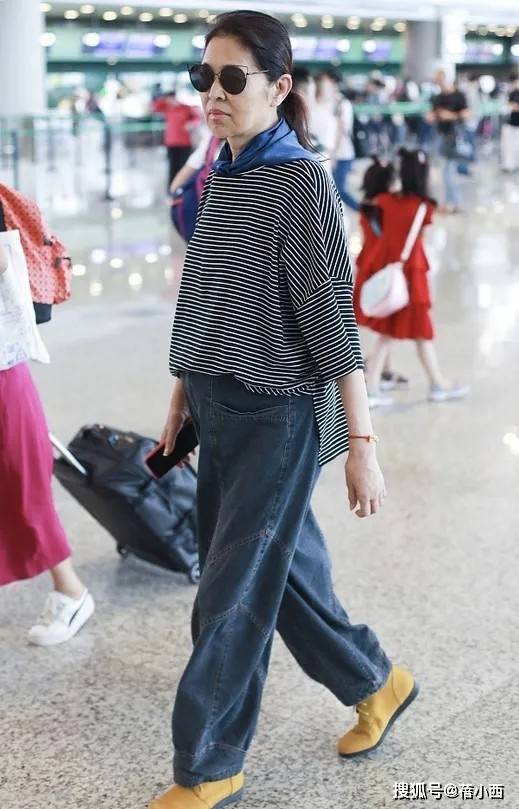 倪萍瘦身后真洋气穿条纹T恤+阔腿裤走机场戴猫咪墨镜不像66岁
