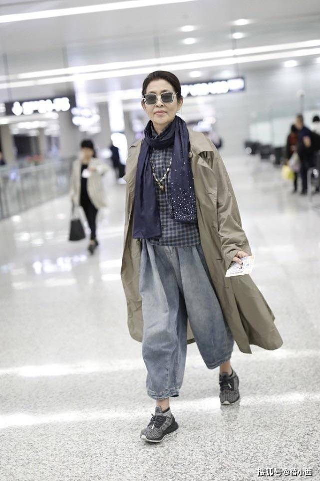最妙的是那条藏蓝色丝巾,提升了造型的层次感,又为沉稳的色调增添了灵动气质,下装的阔腿牛仔裤采用做旧水洗工艺,宽松的裤型与风衣的利落形成呼应。再看脚上的运动鞋,舒适随性,让整套造型在优雅中透出松弛感,66岁的她用经典单品的组合,演绎出了复古与现代交织的时尚魅力。