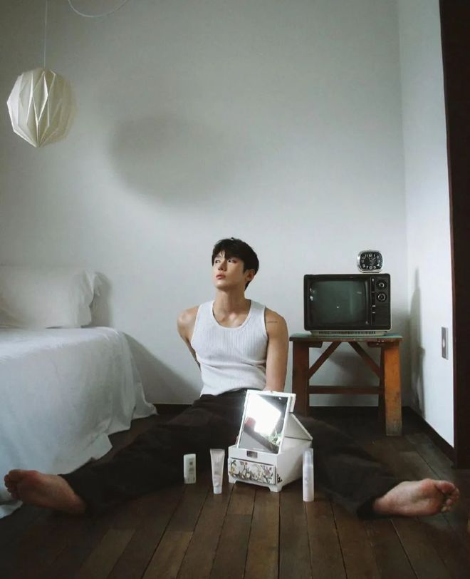 在修身版型的白色背心下,十分推荐男生们考虑宽松版型的裤子,最好是材质有点垂坠和高级质感的西装裤~