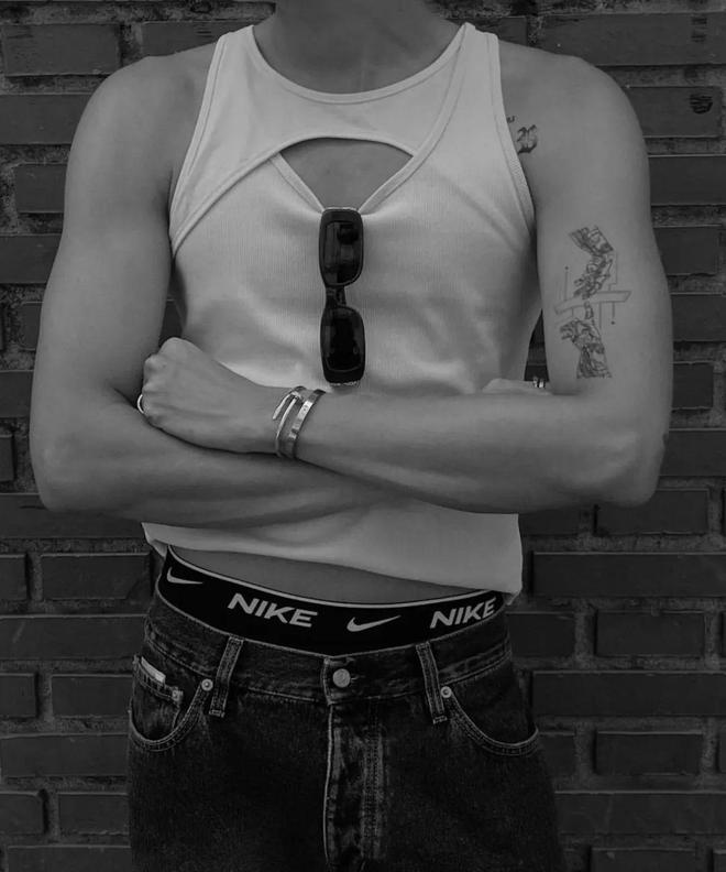 Sagging 穿搭的灵魂依旧可以延伸到今日兴起的白背心look, 选择有明显logo的内裤小露一丢丢,大胆地展示穿搭态度~