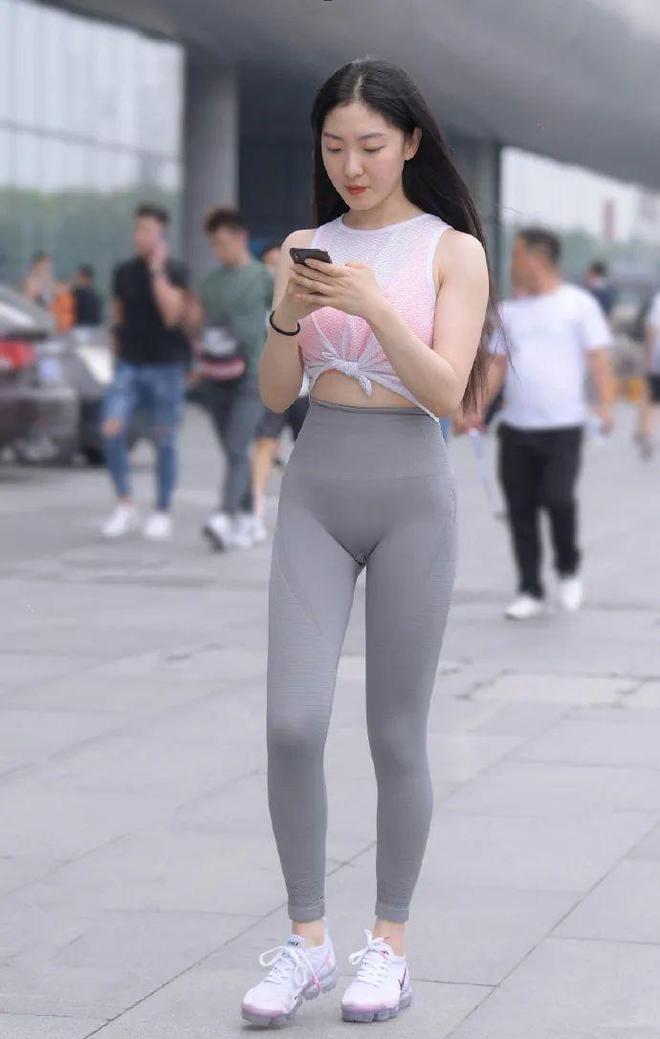 就像街头那些让人眼前一亮的美女,很多都爱穿 “白色背心 + 灰色瑜伽裤” 的组合。这组搭配的色彩选得特别巧妙,干净的白色和低调的灰色撞在一起,既有对比又不张扬,走在人群里很容易让人第一眼就注意到,完全不用靠夸张的款式博眼球。尤其是那件白色透明质感的背心,特别懂夏天的需求 ,轻薄的面料能挡住阳光,又能让皮肤透透气,轻松应对燥热天气,而且若隐若现的通透感,还能悄悄透出几分性感,比普通背心更有味道。