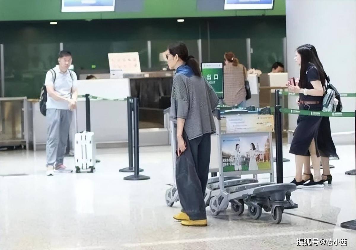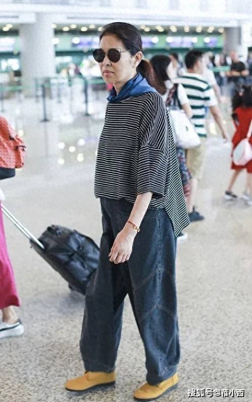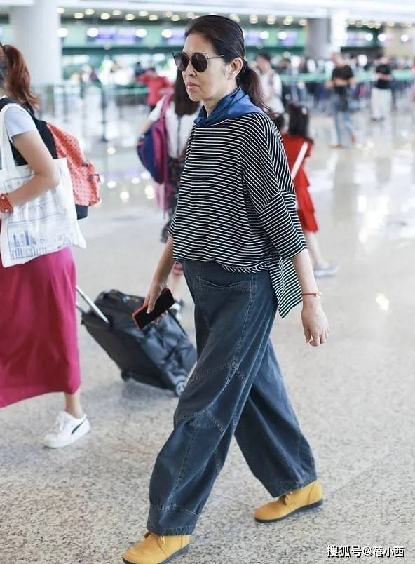倪萍瘦身后真洋气穿条纹T恤+阔腿裤走机场戴猫咪墨镜不像66岁