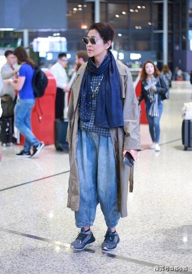最妙的是那条藏蓝色丝巾,提升了造型的层次感,又为沉稳的色调增添了灵动气质,下装的阔腿牛仔裤采用做旧水洗工艺,宽松的裤型与风衣的利落形成呼应。再看脚上的运动鞋,舒适随性,让整套造型在优雅中透出松弛感,66岁的她用经典单品的组合,演绎出了复古与现代交织的时尚魅力。
